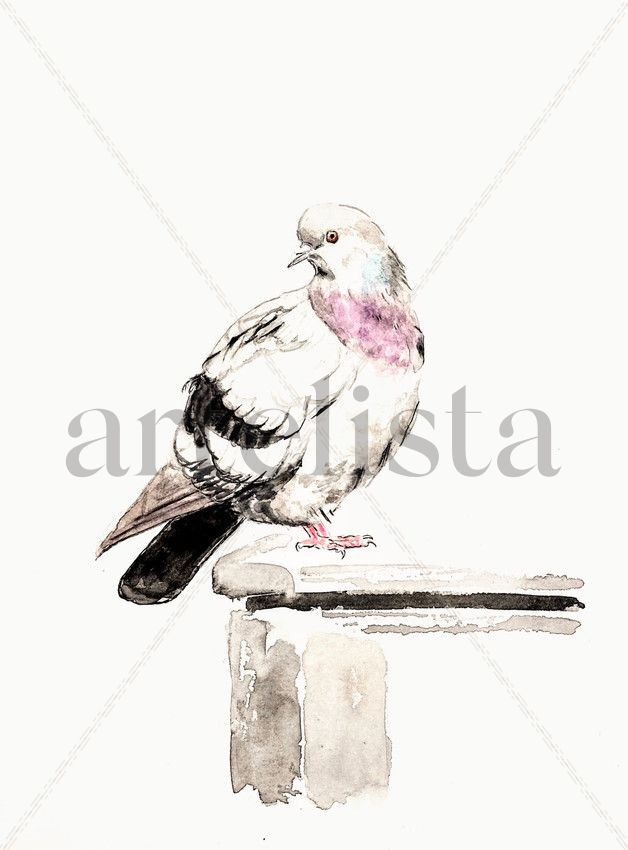 Retrato figurativo no realista de una paloma doméstica posada, en el que el medio se expresa libremente y el trazo es espontáneo