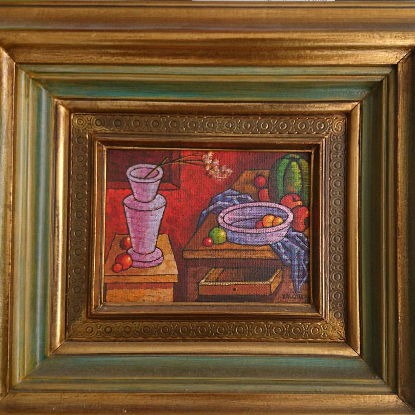 El tratamiento pictórico revela un lenguaje figurativo sólido, con influencias clásicas reinterpretadas desde una sensibilidad moderna, destacando el dominio técnico del artista en pequeño formato.