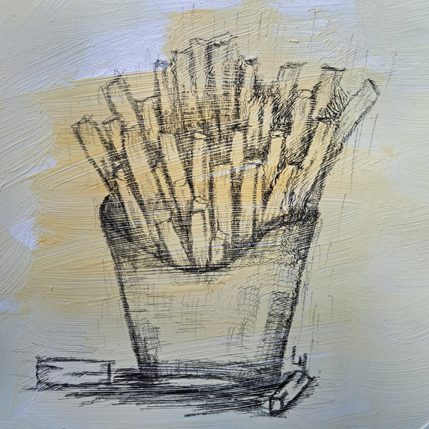 Expressive mixed-media artwork depicting french fries. Bold lines and textural contrast create a dynamic and evocative piece. Contemporary art, food art, drawing, painting, texture