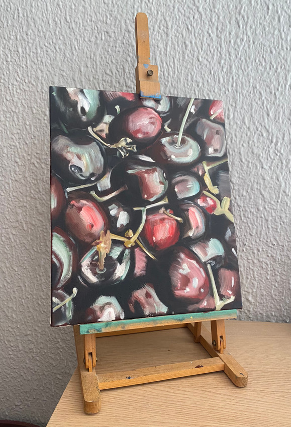 Un bodegón de cerezas rojas que aporta frescura, color y elegancia a cualquier espacio.