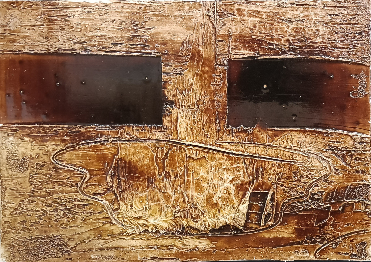 Pequeño bodegón que se enmarca dentro de la colección de alfarería. Realizado con técnica mixta, soporte de tabla realizado con resinas y barnices