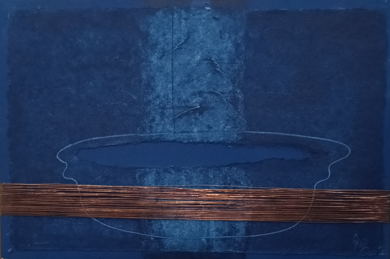 Obra realizada sobre madera con técnica mixta, resinas, barnices, papel, alambre de cobre y pigmento.