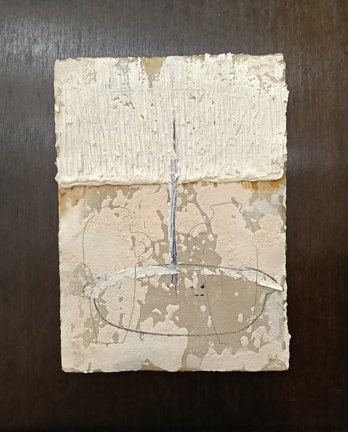Obra realizada sobre papel consolidado con resina epoxídica, a su vez montado dobre madera con técnica mixta, resinas, barnices, árido y pigmento.