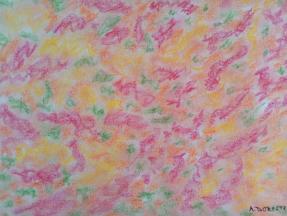 Esta obra presenta una composición abstracta, realizada con trazos suaves y sueltos en tonos rosas, naranjas, amarillos y verdes. Las formas, irregulares y difusas, se entrelazan creando una sensación de movimiento y ligereza, como si fueran hojas o pétalos arrastrados por el viento. La técnica parece ejecutada con pasteles o crayones, sobre una base clara que permite que los colores respiren y se mezclen sin perder su individualidad.