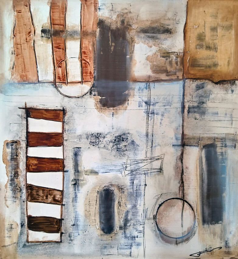 Esta obra de técnica mixta sobre madera presenta un cautivador juego de formas geométricas y texturas. La composición presenta una disposición dinámica de formas, que incluye rayas atrevidas y elementos circulares, sobre un fondo de tonos apagados. El contraste entre los marrones terrosos y los azules suaves crea una sensación de profundidad que invita al espectador a explorar sus intrincadas capas. Cada elemento está cuidadosamente colocado, revelando una estética moderna que resuena con la sensibilidad contemporánea. Esta pieza es una atractiva incorporación a cualquier espacio, ofreciendo un punto focal único que invita a la conversación.