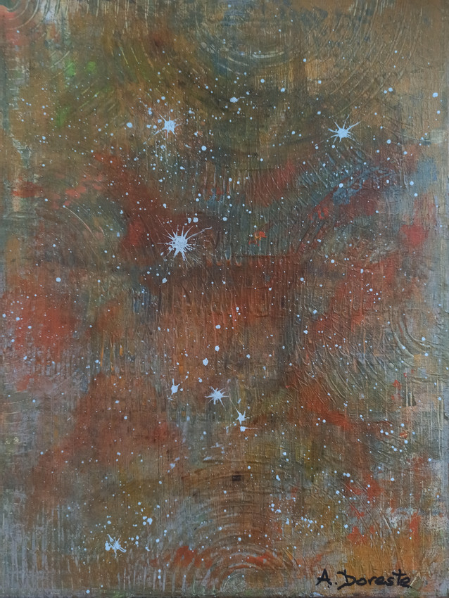 Pintura abstracta con una paleta cálida de ocres, verdes y naranjas terrosos, con capas texturizadas que crean una sensación de profundidad y movimiento. Las salpicaduras blancas recuerdan a estrellas o partículas suspendidas en el espacio, creando una atmósfera cósmica, como un paisaje interior o un cielo nebuloso visto a través del tiempo.