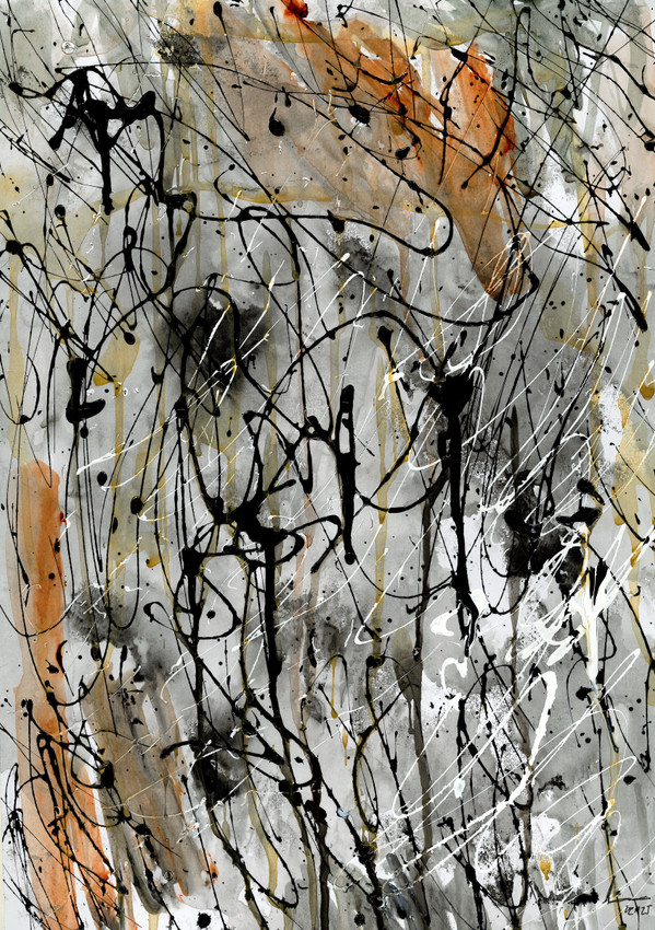 COSMOGRAFIA 01 pertenece a la serie Cosmografías 2025 que versa sobre la realización de la pintura desde la acción, el tiempo, el signo y el significado. En papel pegado sobre cartulina, se utiliza el goteo, la proyección de esmaltes, la transferencia por presión y la impresión de papel sobre papel...Estas técnicas por su naturaleza y ejecución dan lugar a unas piezas dinámicas que proyectan profundidad y tensión espacial.