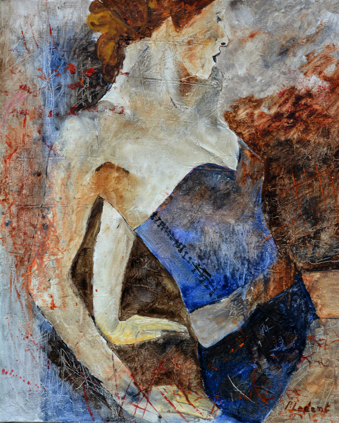 This captivating work presents a stylized female figure, dominated by earthy tones and shades of deep blue. The composition expresses a fusion of the abstract and the figurative, evoking elegant movement. Textured brushstrokes create a palpable dynamism, accentuating the tension between areas of light and shadow. The figure's slightly twisted pose conveys timeless sophistication and grace. Subtle details, such as the contrast between the blue corset and the chaotic background, intensify the emotion and captivate the viewer. The bold yet harmonious blend of colors brings the work to life and lends it remarkable depth. It is a piece that invites contemplation, oscillating between mystery and pure artistic expression.