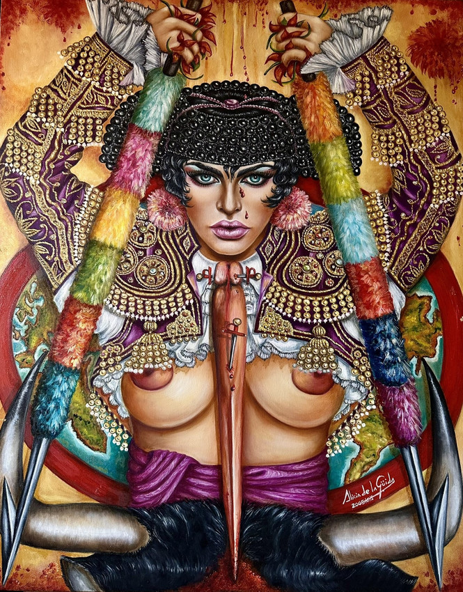 El mundo de los toros es un mundo cerrado para las mujeres, igual que otros muchos mundos en la vida. Esta mujer convierte el ritual del enfrentamiento en un acto de absoluta soberanía. Con sus brazos elevados y los banderines multicolor tensados como armas ceremoniales, domina el espacio con una mezcla incendiaria de belleza, rabia y control. La vida hay que torearla según embistan sus vaivenes, por eso su mirada "afilada y dolorosamente humana" revela una lucha que es más interior que pública. Los cuernos y la daga que apuntan a su pecho transforman la composición en un mito: hombre, mujer y poder, la fuerza y la vulnerabilidad, la tradición y la rebelión se funden en un mismo cuerpo femenino que se niega a ser sometido. Cada trazo es fuego, cada textura es memoria. Aquí, la mujer no interpreta al torero: lo trasciende.