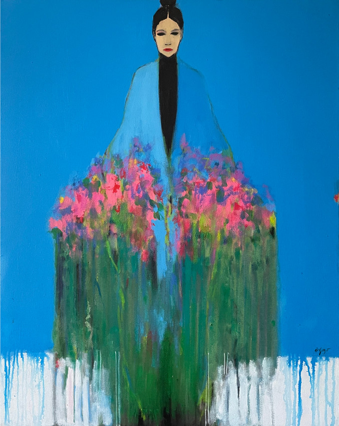 Esta obra forma parte de una serie que explora la feminidad como una combinación de delicadeza y fuerza inquebrantable. La figura femenina, representada de manera frontal y solemne, parece fundirse con un ramo exuberante de flores, símbolo de resiliencia interior y profundidad emocional.