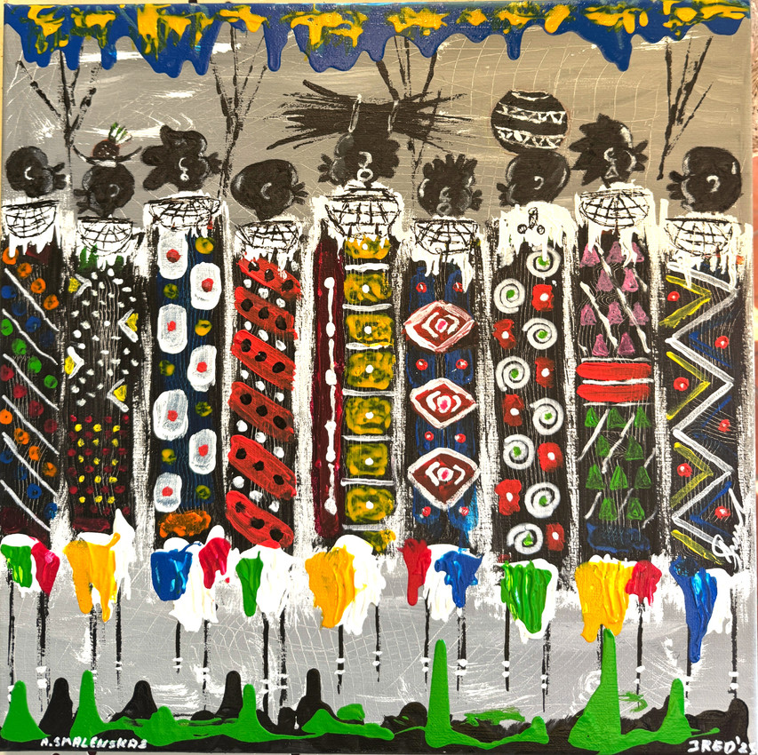 El estilo general es moderno y abstracto, pero posee una profunda resonancia cultural, que posiblemente evoca temas como la comunidad, la tradición y el paso del tiempo. Las figuras se muestran fuertes, firmes y conectadas con la tierra, como lo simboliza la paleta de colores terrosos y la fluidez de los patrones y colores. La obra tiene una cualidad enérgica y dinámica, donde cada sección contribuye a una sensación general de armonía y equilibrio.