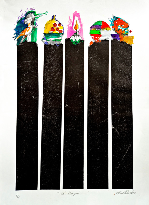 La obra “El apagón” presenta una fuerte carga simbólica que combina lo abstracto con lo conceptual. Cinco columnas negras se elevan verticalmente, rígidas y dominantes, como si representaran la oscuridad o la interrupción de la energía vital. En contraste, en la parte superior de cada columna emergen estallidos de color que evocan la persistencia de la vida, la creatividad y la identidad en medio de la ausencia de luz. Este contraste entre el negro opresivo y las formas cromáticas vibrantes puede interpretarse como una metáfora de la resistencia humana ante la censura, la crisis o el silencio impuesto: cuando todo parece apagarse, aún surgen destellos de expresión y esperanza.