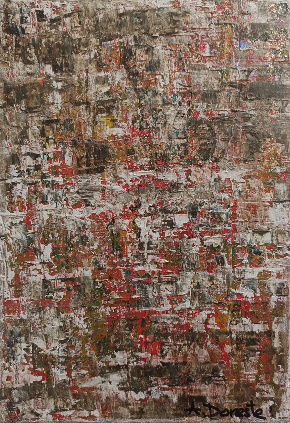 Este cuadro es una obra abstracta con una fuerte textura y un uso dinámico del color. Predominan los tonos terrosos (marrones, ocres y grises) combinados con manchas intensas de rojo, blanco y algunos toques verdes y amarillos. La técnica parece realizada con espátula, generando capas superpuestas que transmiten la sensación de un muro envejecido, desgastado por el tiempo, con huellas de pintura que se han ido acumulando y erosionando.