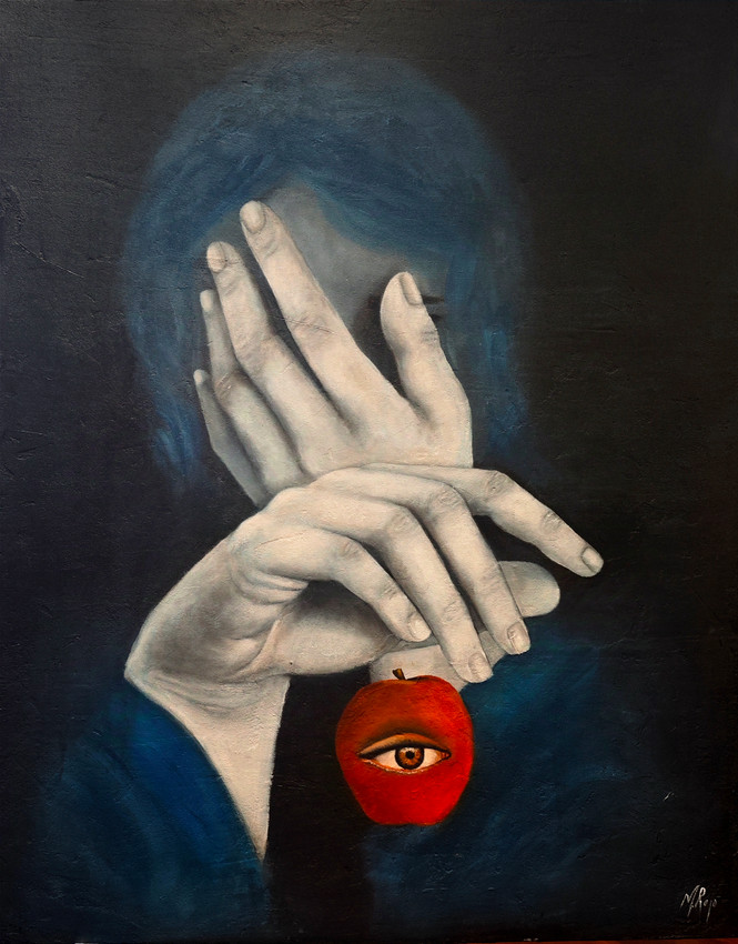 "Entre manos que esconden el rostro, surge una manzana con un ojo que todo lo ve. Misterio, introspección y deseo se funden en esta pieza surrealista, donde lo oculto y lo revelado conviven en silencio."