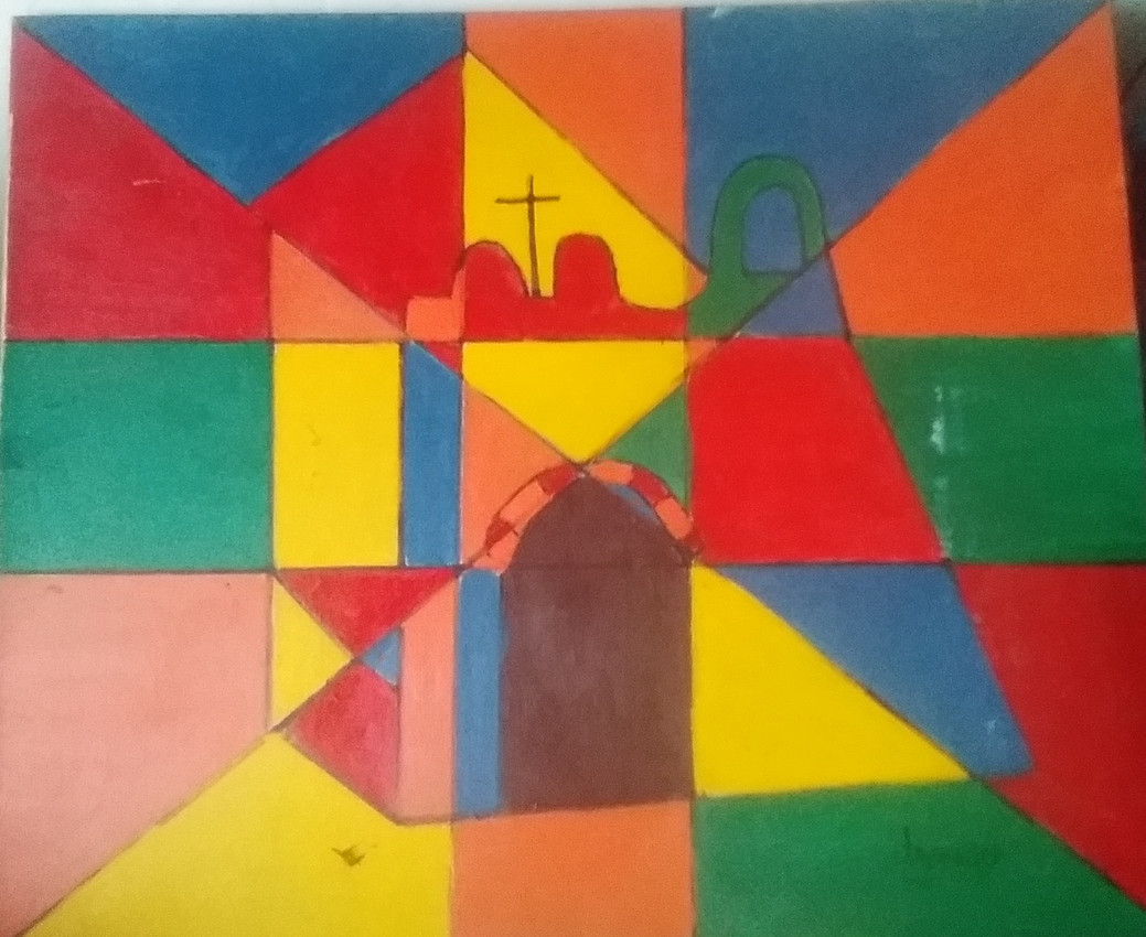 Acrílico sobre lienzo, integrante de una serie denominada "Templos". Obra realizada por un médico, radicado en Venezuela, durante su etapa de estudios de artes plásticas en simultáneo con los estudios de medicina en la década de los 70s. Expresa la complejidad implícita en la motivación religiosa de la obra, acompañado de una lluvia de colores palpitantes.