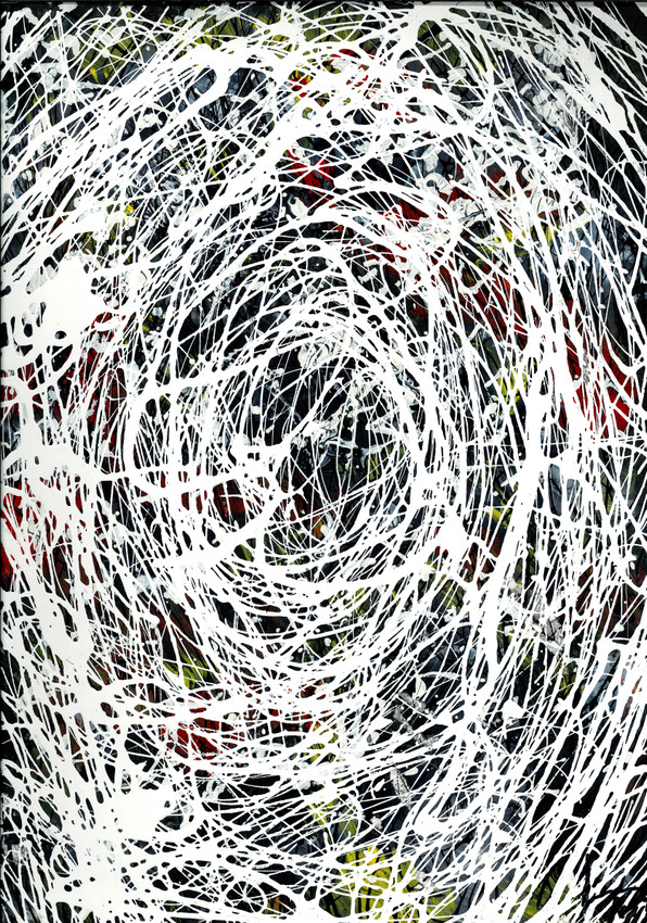 ESPIRAL 04 se resuelve con pintura y esmalte acrílicos en blancos y negros, disponiendo un fondo negro sobre el que se entrecruzan madejas de líneas blancas continuas goteadas que forman espirales de relieve.