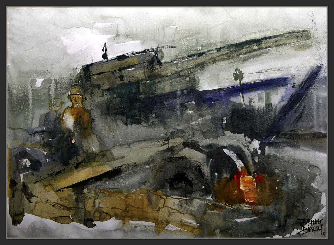 Piezas de artilleria antiaérea de la Legión Condor alemana en el Museo de la Batalla del Ebro de Fayón el mítico cañón 8,8 Flak que también sirvió como antitanque y fue muy utilizado, más tarde, en la Segunda Guerra Mundial, pintura del artista pintor Ernest Descals con acuerelas sobre papel de 50 x 70 centímetros. En la obra he querido fusionar al soldado con el cañón en una atmósfera poética y valores plásticos con sabor a hierro, obras sobre la Guerra Civil de españa y su historia, personajes y armas.