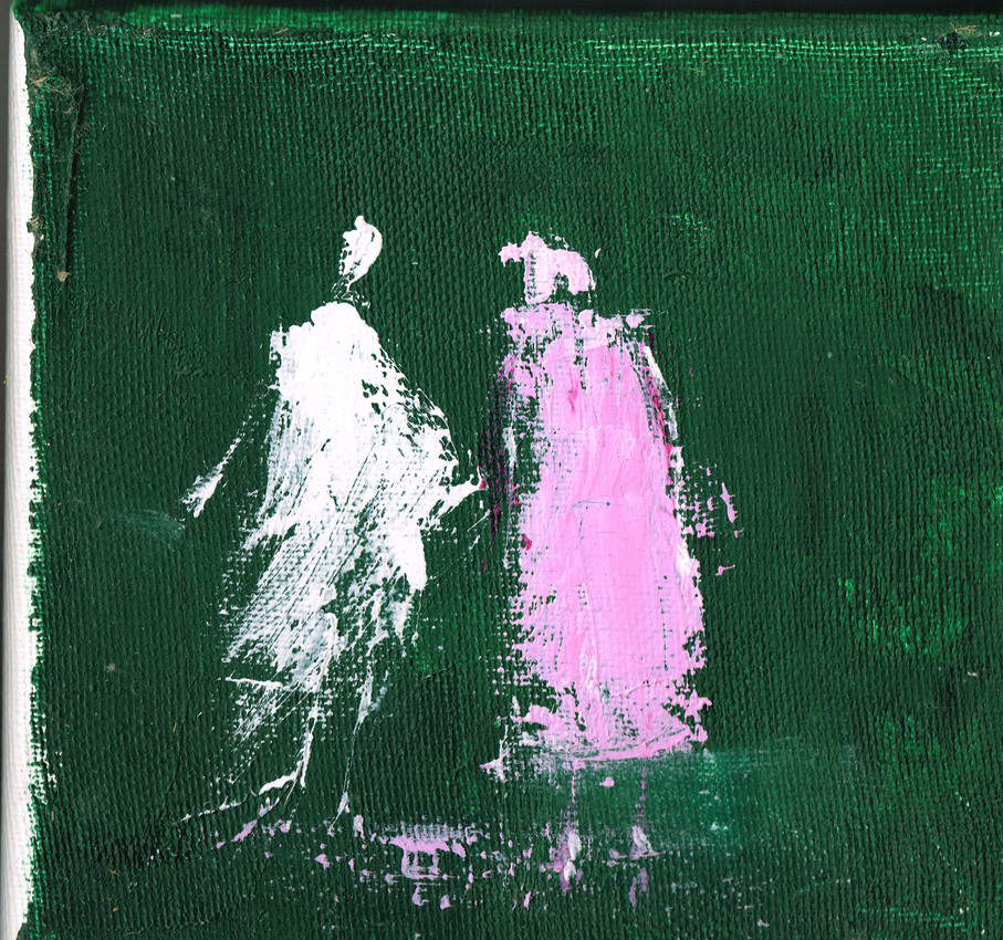 Pequeño formato de 15x15 centímetros. El fondo es óleo y las figuras acrílico.
