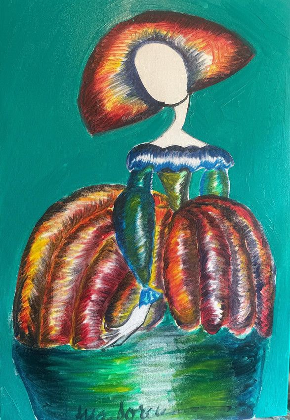 El tocado parece envolverla como un aura, dándole un carácter regio o protector, como si llevara consigo su propia atmósfera emocional. El hecho de que no haya rostro permite que el espectador proyecte su propia identidad o historia en ella, haciendo la obra abierta y personal.