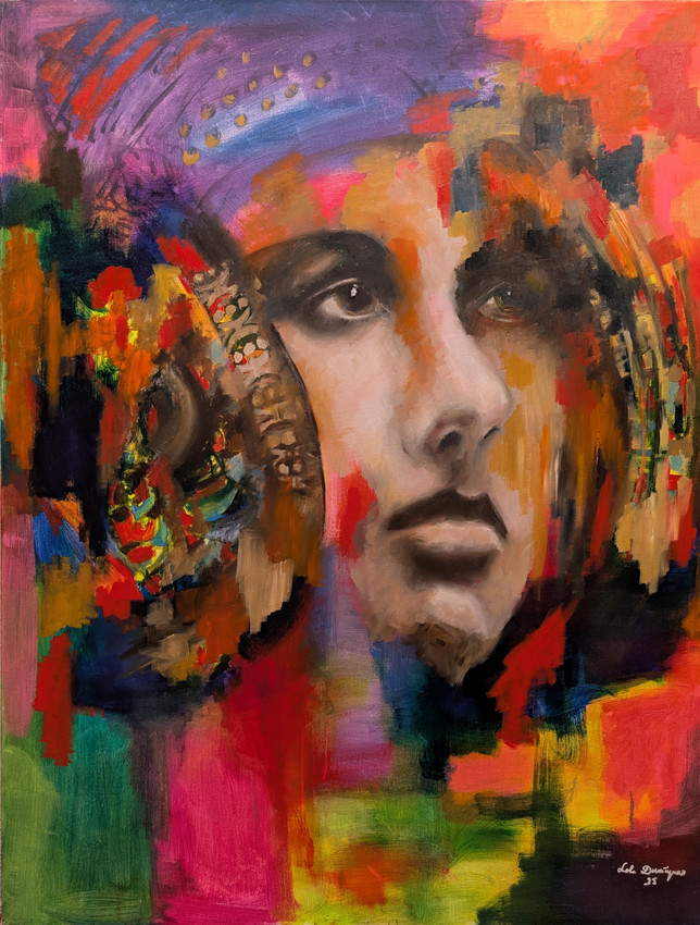 La obra reinterpreta la icónica figura de la Dama de Elche desde una mirada contemporánea, fusionando realismo y abstracción. El rostro emerge con un delicado modelado clásico, mientras que los colores intensos y expresivos generan un aura vibrante que conecta lo ancestral con lo moderno. Entre veladuras y contrastes cromáticos, se evoca el misterio y la fuerza simbólica de esta pieza fundamental del patrimonio ibérico.