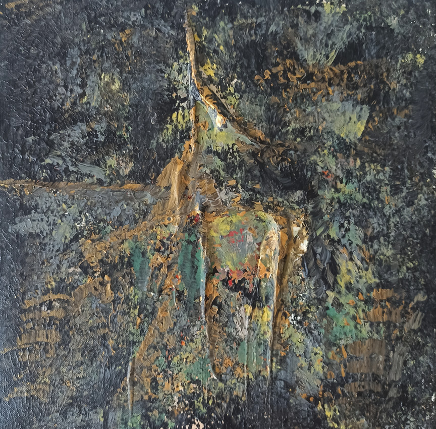 En el centro se distingue una figura que, aunque no es claramente definida, puede sugerir un animal emergiendo desde un fondo boscoso y sombrío. La sensación es la de algo vivo intentando abrirse paso entre la penumbra, como si se tratara de una lucha entre luz y sombra, vida y oscuridad.