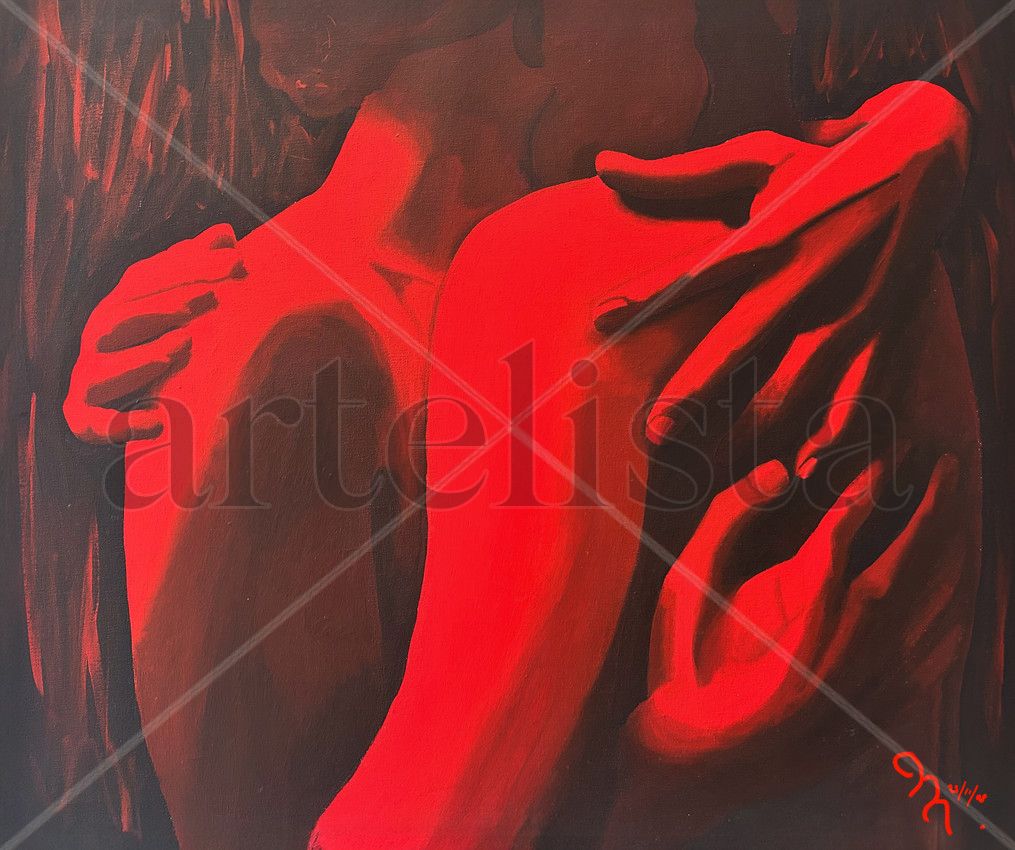 Nota técnica: La textura del acrílico, aplicado en capas semitransparentes y veladuras, enriquece la profundidad del rojo, mientras que el lienzo aporta un soporte orgánico que acentúa la emotividad de la escena.