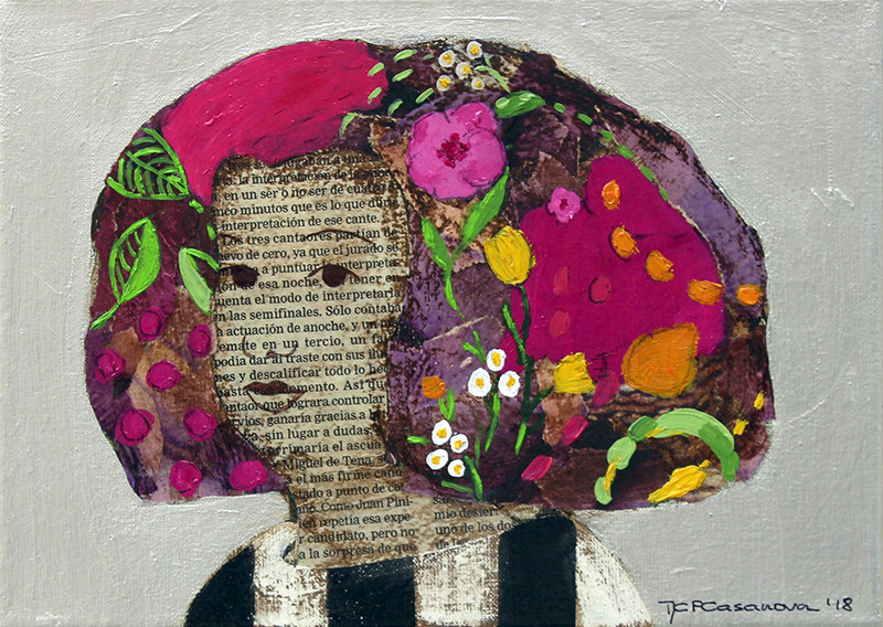 Acrílico y collage sobre lienzo. Fondo color plata.
