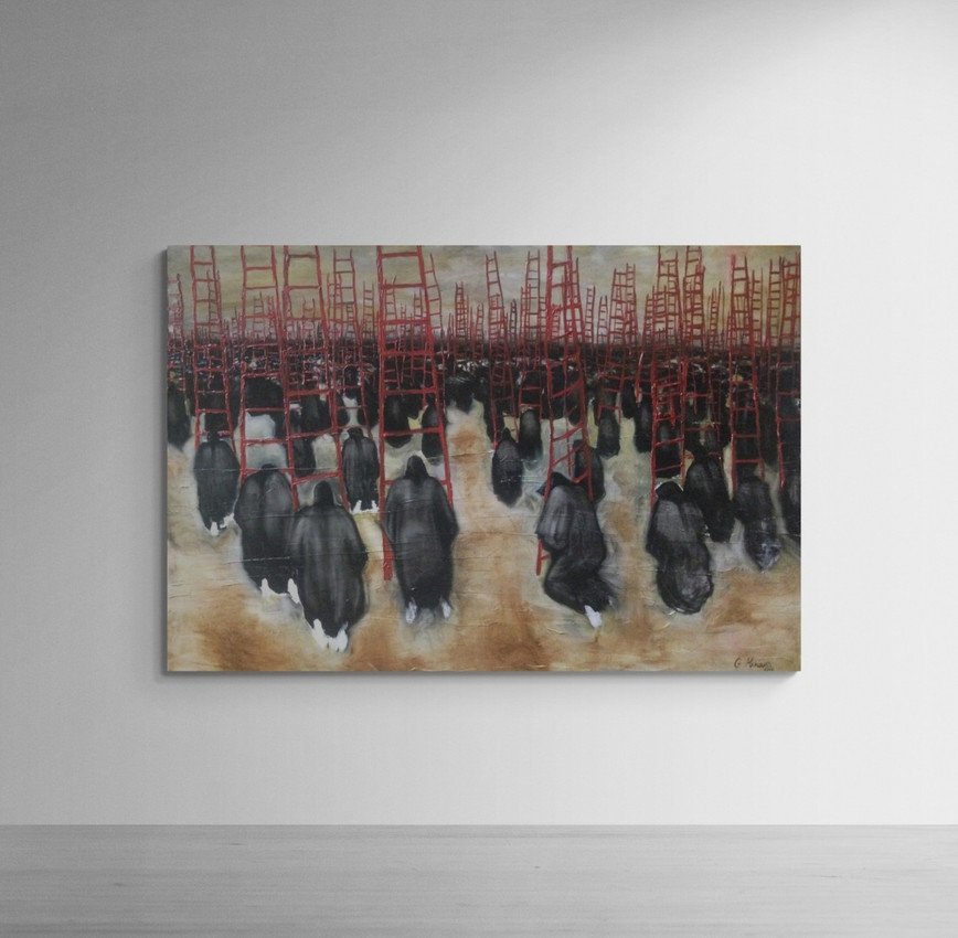 “Knocking on Heaven’s Doors” is an early series by GELA MIKAVA that explores the human struggle, collective suffering, and the eternal search for transcendence. The paintings move from figures immersed in shared pain, to darkened silhouettes reaching upward, and finally to ladders standing alone as pure symbols of hope. Through the stark use of red, black, and white, MIKAVA transforms human despair into a universal metaphor: the desire to break through boundaries and touch the infinite. This series invites viewers to reflect on humanity’s resilience, faith, and the unyielding urge to reach beyond.