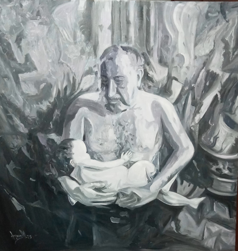 El abuelo dormiendo al nieto, obra realizada con tres colores al oleo