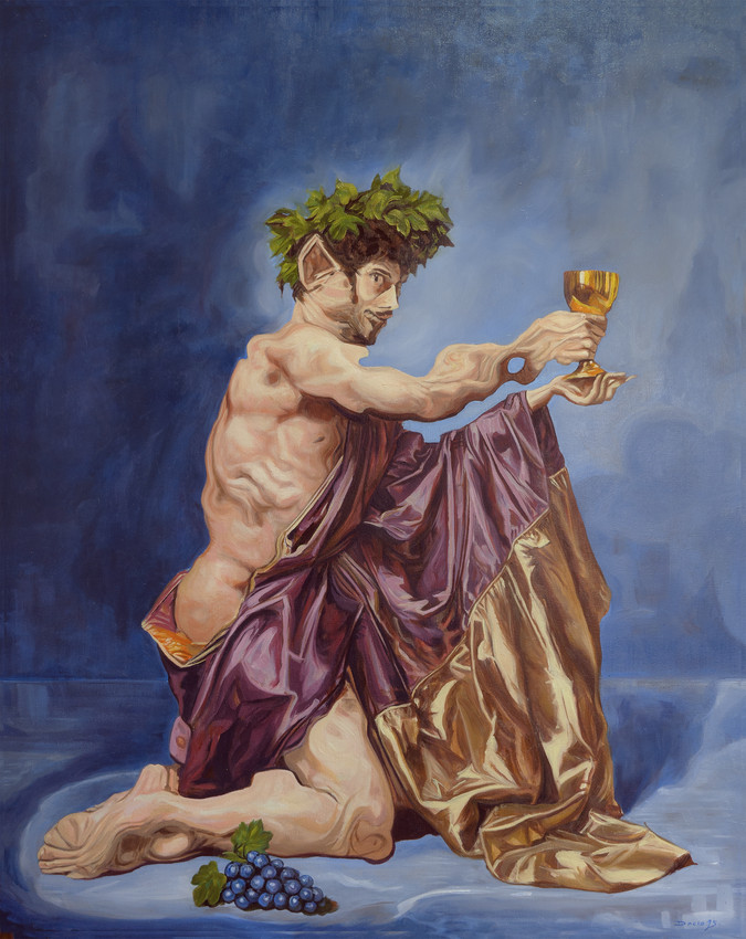 En la obra vemos a Dionisio, coronado de vides, sosteniendo un cáliz dorado. Su gesto no es frontal ni entregado directamente al espectador: es un ofrecimiento insinuado, suspendido en el aire, casi como una promesa. Esta ambigüedad dialoga con Prometeo: si él entrega el fuego sin reservas, abriendo el camino de la técnica y la civilización, Dionisio mantiene el vino como invitación velada, accesible solo a quien se atreva a reconocer su poder. El fuego prometeico es claro, útil, progresivo; el vino dionisíaco es oscuro, extático, peligroso. Ambos dones transforman a la humanidad, pero cada uno encierra su ambivalencia: progreso y exceso, comunidad y desorden, claridad y embriaguez. Aquí, Dionisio no impone ni regala sin condición: su gesto sugiere que la verdadera iniciación no se recibe pasivamente, sino que exige apertura interior. El espectador queda así en el umbral, invitado y advertido al mismo tiempo.