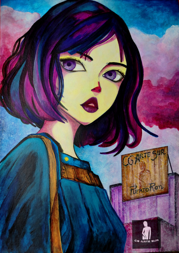 Viaje en el Tiempo. Visitando Puerto Ron. Obra: Cyberpunk Anime. Acrilico sobre papel canson Medida: 29,7 x 42 cm/300 gr.