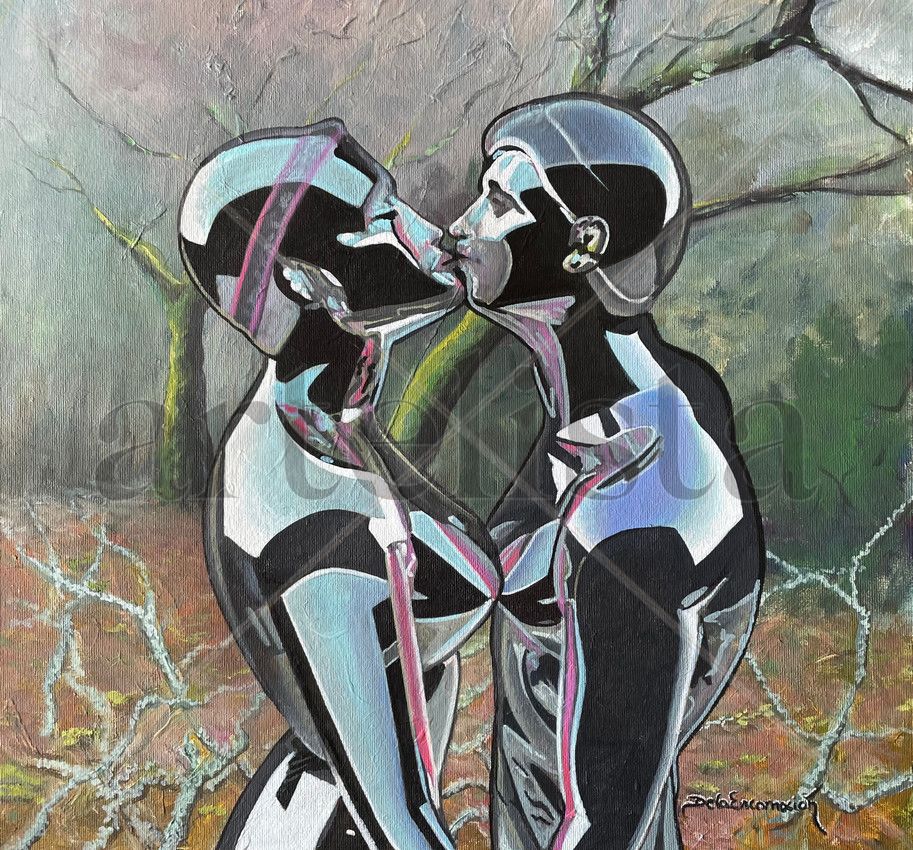 Sobre un paisaje de otoño pintado al óleo se imponen figuras metálicas besándose pintadas con acrílicos Tecnica mixta sobre lienzo 40 x 40 cms.