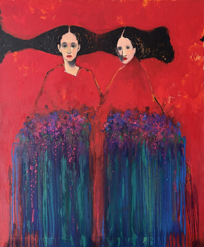 “Sisters of the Inner Garden” explores the silent tension between intimacy and individuality. Two figures emerge from an ocean of color — bound by a shared presence, yet separated by invisible psychological walls. Their mirrored forms and intertwined black hair create a visual bridge between connection and solitude, evoking the fragile equilibrium of identity and emotional memory.