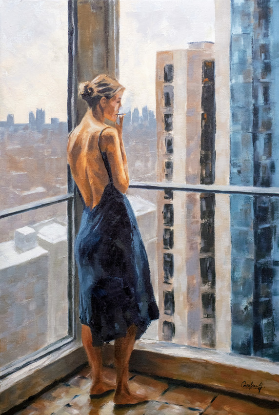 Crafted with oil on canvas, the warm tones of the subject's skin and the diffused light create a captivating contrast with the cooler, geometric lines of the buildings. This interplay of light and shadow enhances the feeling of a fleeting, intimate moment suspended in time. The painting is a fine example of contemporary expressionism.