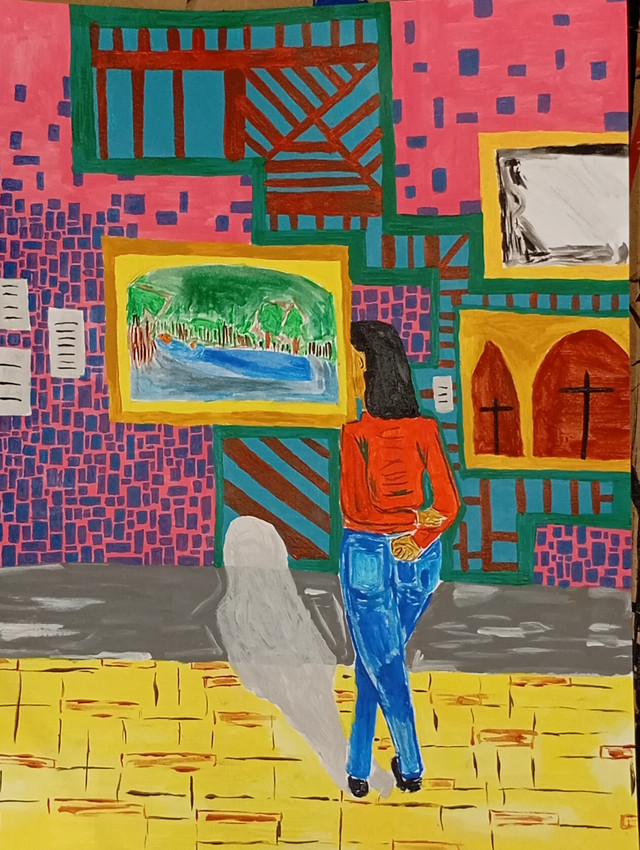 Escena de una chica en la galería de un museo.