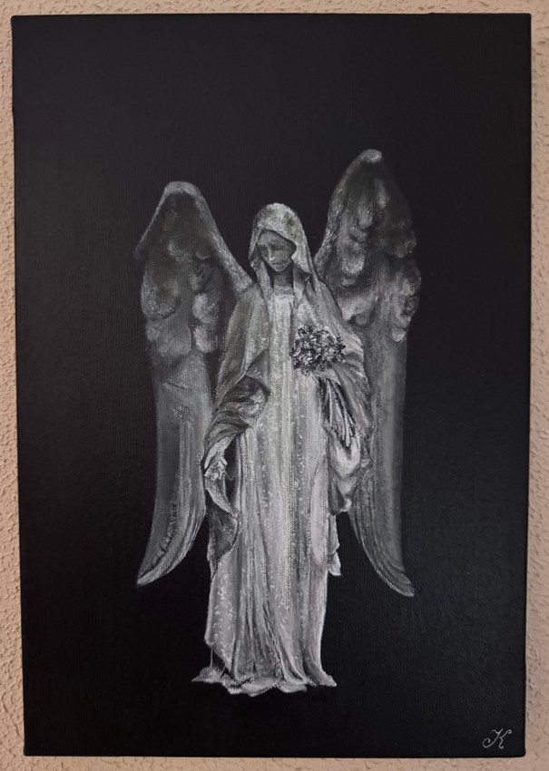 Is a monochromatic painting that captures the ethereal stillness of a funerary angel. Rendered in shades of grey and white against a stark black void, the figure embodies both fragility and strength. With is hooded gaze and gentle gesture, the angel appears suspended between life and death.