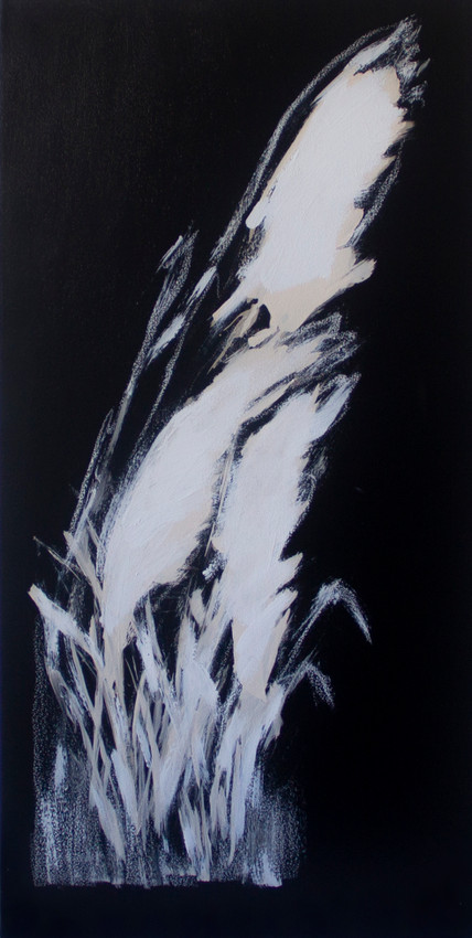 Las cortaderas se presentan despojadas de su contexto habitual. Lo vegetal se transforma en trazo, gesto y presencia suspendida. Cada parte del díptico encarna una energía distinta: una más vertical e íntima, otra más abierta y enraizada. Juntas crean un equilibrio sutil entre lo etéreo y lo terrenal.