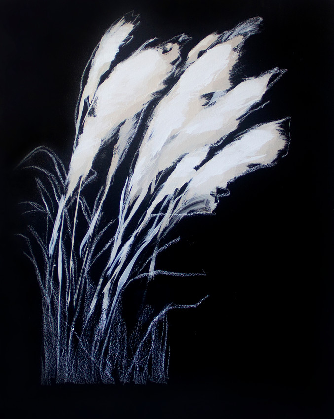 Las cortaderas se presentan despojadas de su contexto habitual. Lo vegetal se transforma en trazo, gesto y presencia suspendida. Cada parte del díptico encarna una energía distinta: una más vertical e íntima, otra más abierta y enraizada. Juntas crean un equilibrio sutil entre lo etéreo y lo terrenal.