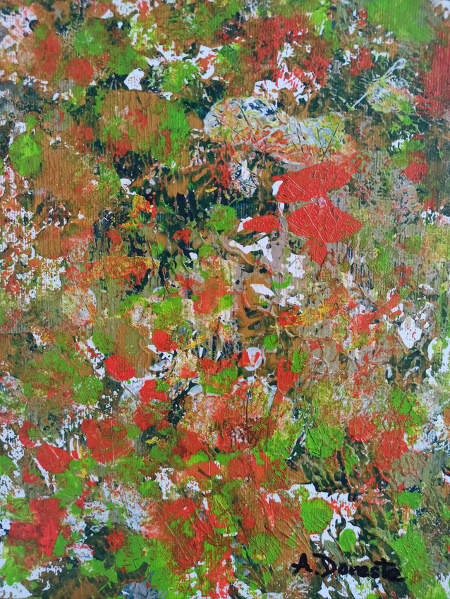 Este cuadro es una obra abstracta que utiliza una explosión de colores cálidos y vibrantes. Predominan el verde, el rojo, el naranja y algunos toques de blanco, con pinceladas enérgicas y superpuestas que generan textura y dinamismo. La composición recuerda a un campo lleno de flores en plena primavera o a la vitalidad de un bosque en transición de estaciones.