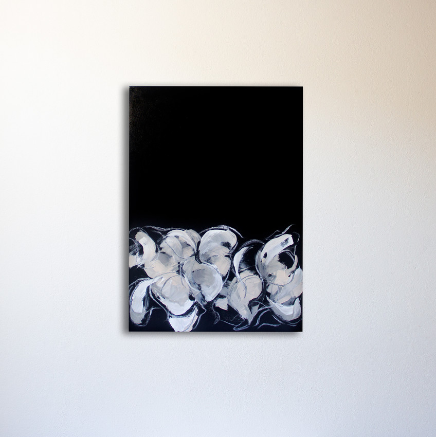 En esta obra, la flor ya no está sola. Se vuelve compañía. Las formas se agrupan con suavidad, como si compartieran algo íntimo.
