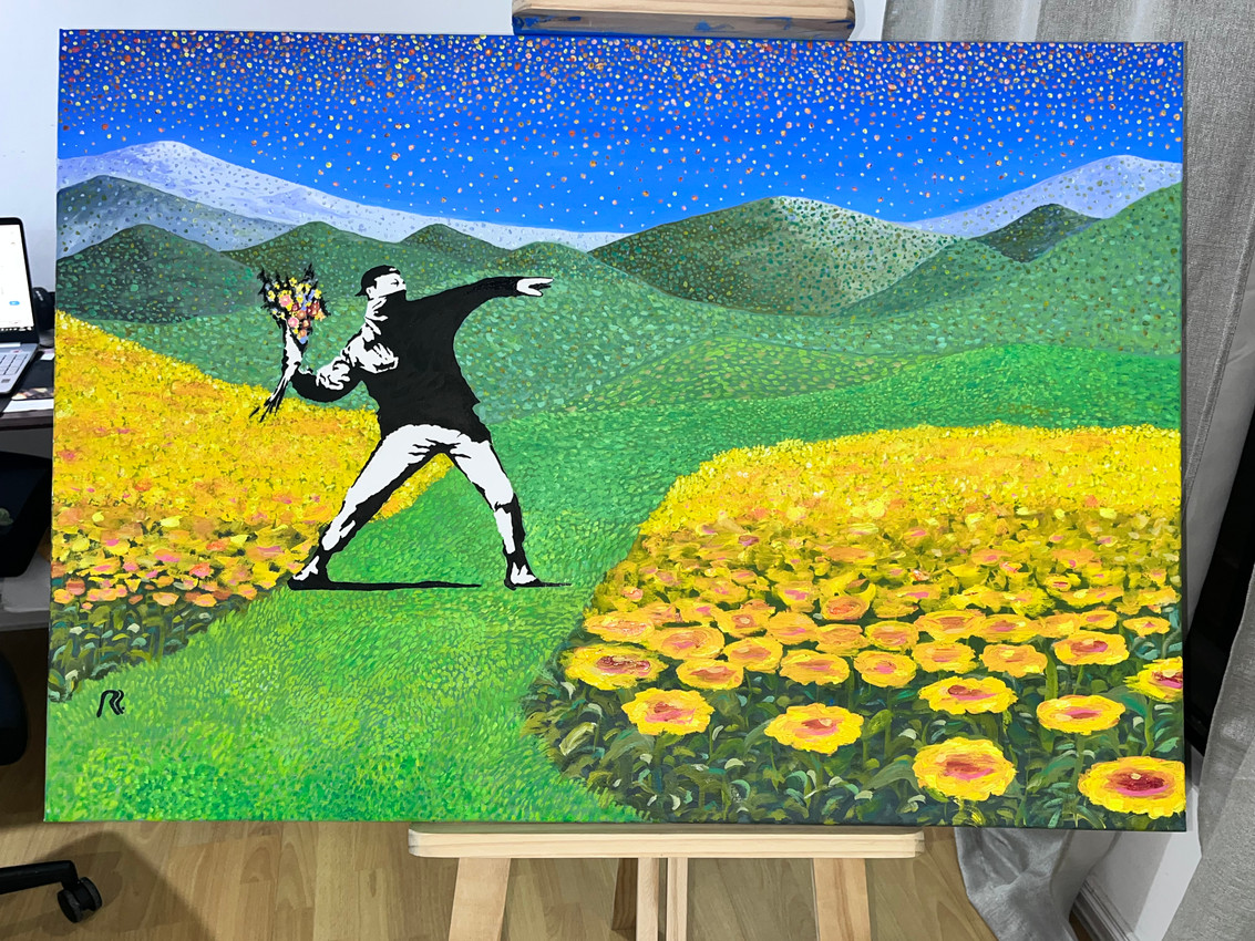 Artistic appropriation of a character of my favorite artist "Banksy" to place it in an idealistic environment. Oil on canvas.