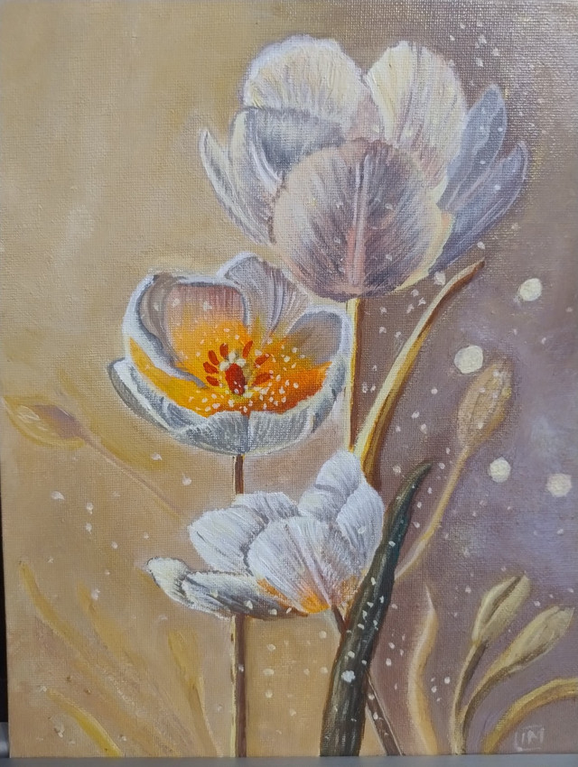 Flores que no solo florecen, sino que brillan desde adentro. Esta obra nació de ese momento tranquilo donde el alma respira y el color habla bajito. Un homenaje a la belleza sutil, esa que no grita, pero te toca.