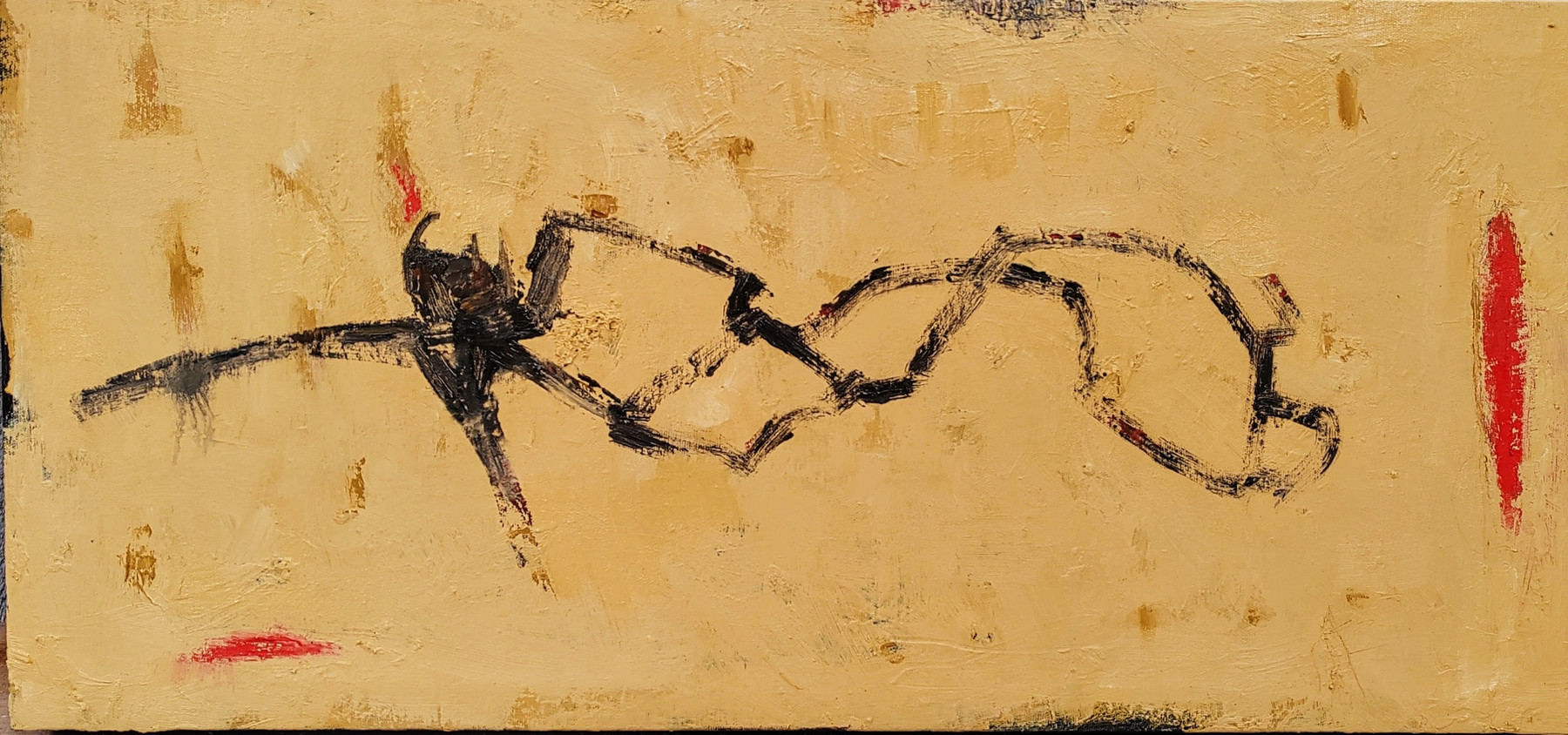 La línea, que contrasta fuertemente con el fondo, creando una tensión visual que dinamiza la composición. Las marcas rojas y amarillas, en su aparente aleatoriedad, revelan el fruto de ese fluir, una búsqueda de un equilibrio entre el caos y el orden.