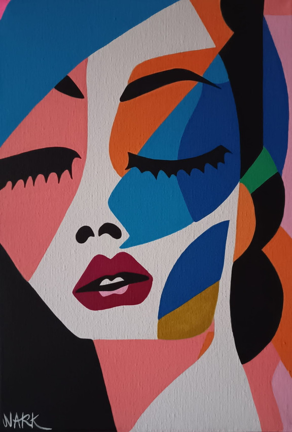 "Fragmentos del Silencio" es un retrato cubista que captura la intimidad introspectiva de una mujer. Su rostro, dividido en planos geométricos de tonos suaves y lunares, se desarticula para mostrar el perfil y el frente simultáneamente. Con el pelo negro recogido con fuerza, su mirada se cierra para refugiarse en sí misma, mientras su boca entreabierta evoca un suspiro congelado. La obra es una exploración lírica de la identidad, donde cada arista y color cuenta una parte silenciada de su historia.