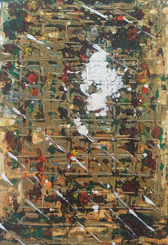 La pintura muestra una superficie cuadriculada que funciona como base estructural, casi arquitectónica, sobre la que se despliega un estallido de manchas, goteos y líneas diagonales. Los tonos predominantes —ocres, verdes, rojos oscuros y amarillos— evocan materia orgánica atrapada dentro de un orden rígido. Entre ese entramado aparece un núcleo blanco agrietado que actúa como punto de tensión, una interrupción luminosa que parece romper la regularidad del fondo. Las salpicaduras blancas que cruzan el lienzo en diagonal añaden velocidad, como si fueran trazos que rasgan la superficie o señales de un movimiento que continúa más allá del cuadro.