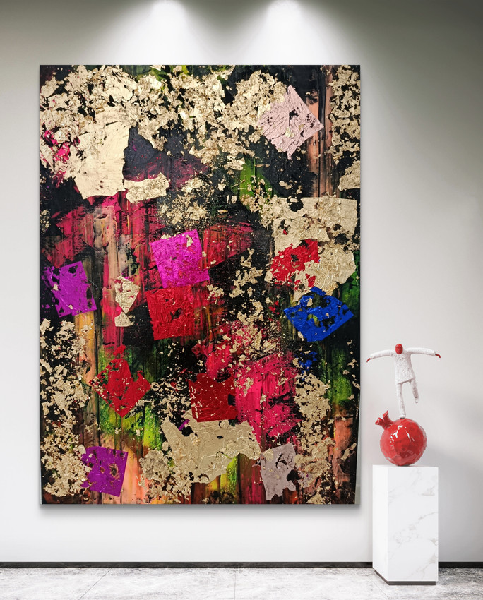 Explosión de color que desafía las leyes de la física y la lógica esta obra abstracta parece haber sido pintada con la energía misma de una supernova, los pigmentos vibrantes fucsias eléctricos, verdes neón, azules galácticos y dorados líquidos se entrelazan como si fueran corrientes de pensamientos viajando entre dos universos paralelos. La imaginación es el portal que conecta mundos .