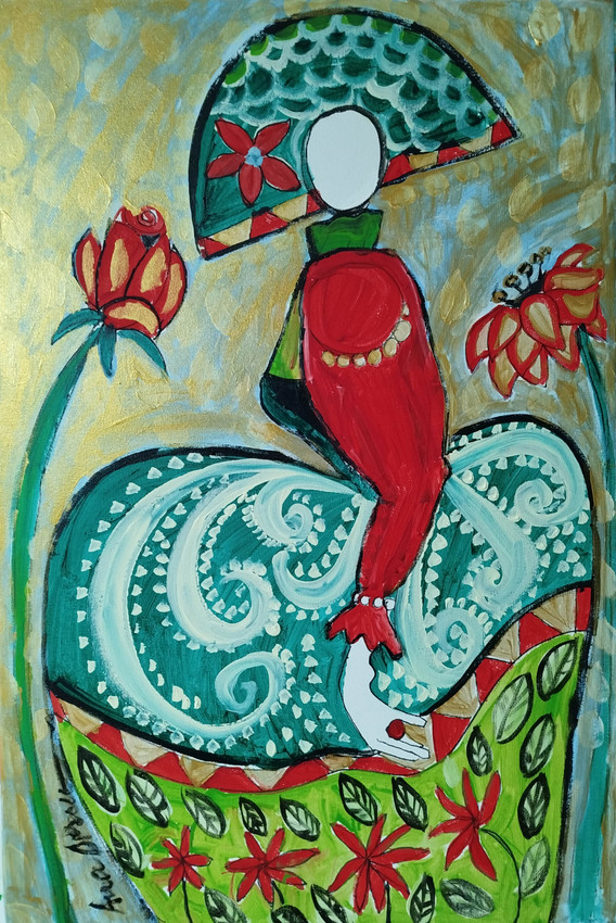 Su vestidura se transforma en naturaleza viva, su presencia se afirma sin rostro impuesto.