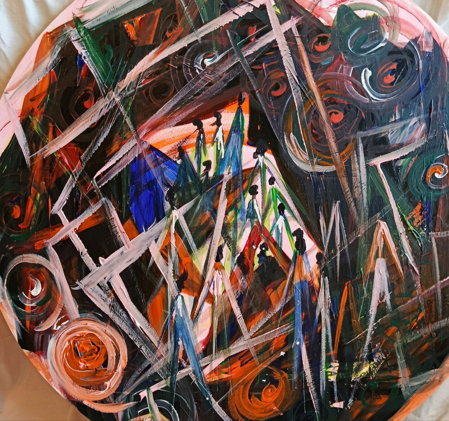 Acrílicos sobre lienzo. Refleja y hace reflexión a la frenética vida que llevamos. Al fondo se aprecian personas , perdidas y estresadas a ojos ( espirales) de las que les observan.