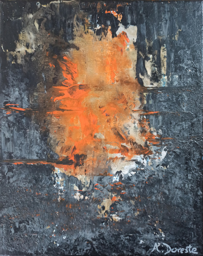 La obra muestra una pintura abstracta con una atmósfera intensa y contrastada. Predominan los tonos oscuros (negros, grises y azul profundo) que crean un fondo denso y texturizado, como si fueran capas de humo, roca o agua en movimiento. En el centro destaca una explosión de colores cálidos —naranjas, ocres y toques de blanco— que parecen surgir o expandirse, generando una sensación de energía, fuego o luz que rompe la oscuridad. La textura es rica y rugosa, con pinceladas y manchas que aportan dinamismo y profundidad, evocando una fuerza natural o una emoción intensa emergiendo del fondo.