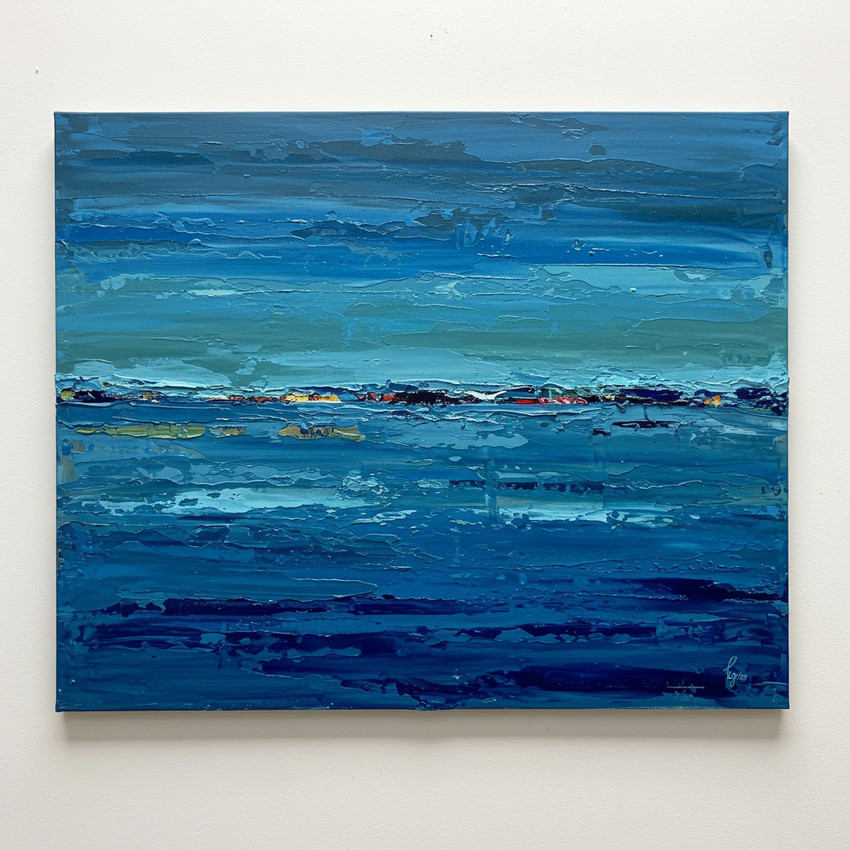 Este óleo sobre lienzo nace de mi fascinación por la profundidad del mar. A través de capas de azul y sutiles destellos de luz, busco transmitir calma, amplitud y la sensación de un horizonte infinito.